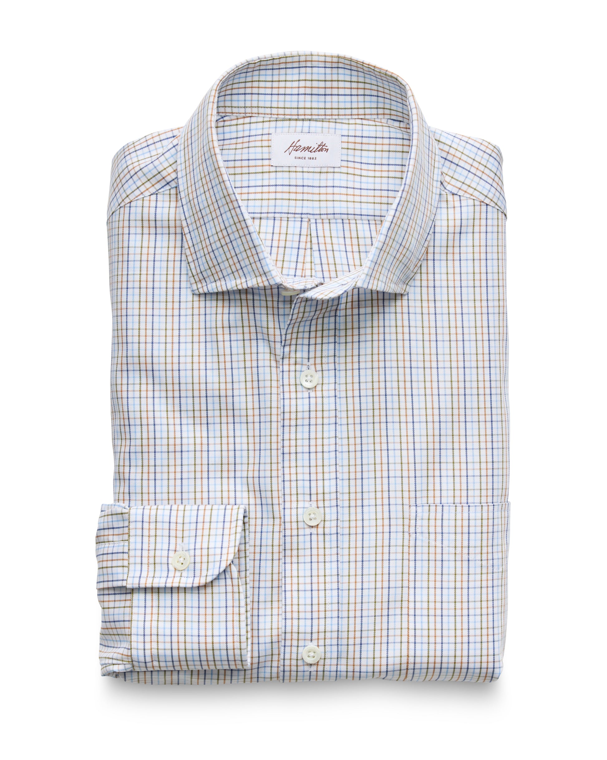 A crisp cotton twill is highlighted by intersecting grids of blue, olive, and mustard.